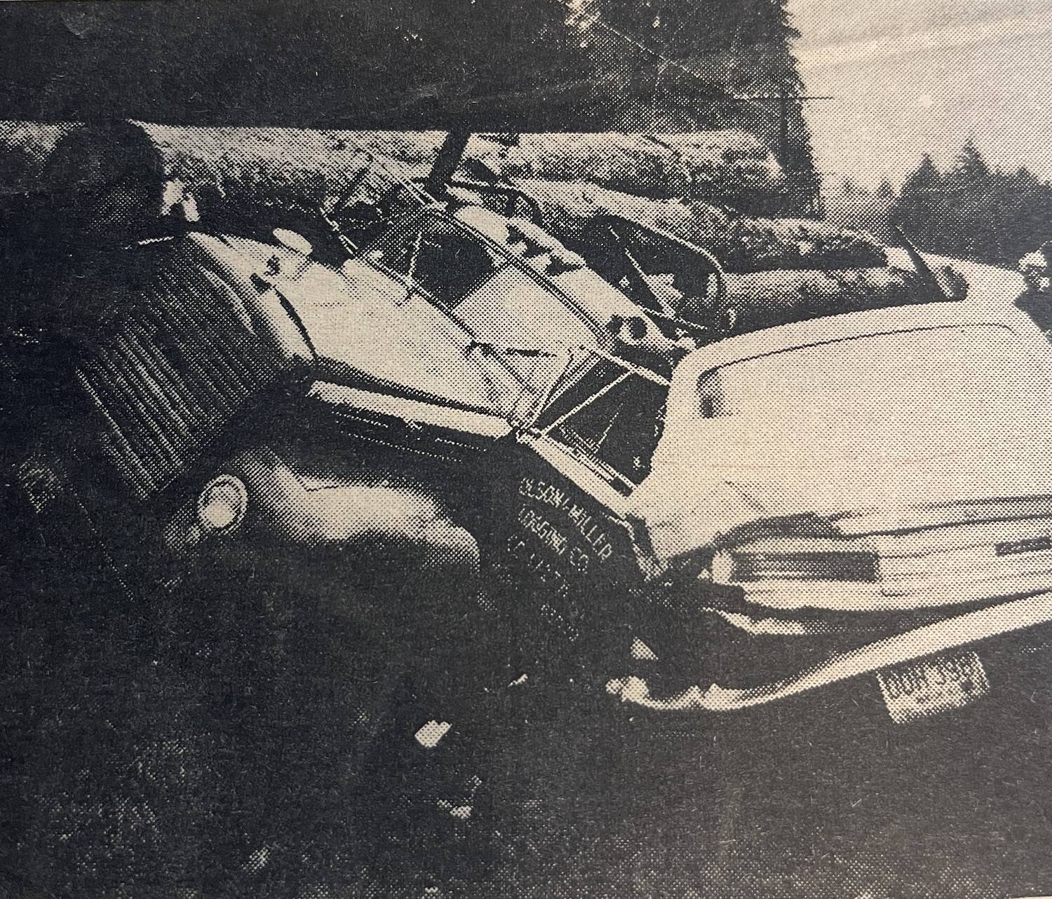This week in 1968, a car vs. an Olson & Miller log truck accident, that looked bad, resulted in no injuries to truck driver Gene Coats and vehicle driver Clint Cross (photo). Three Forks students received certificates for being Outstanding Teenagers of America (photo).
