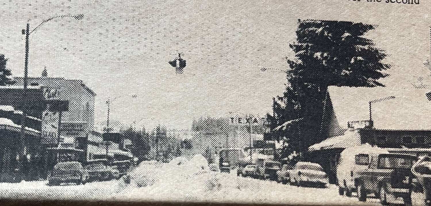 In 1969 the snow was piled up down the middle of Mainstreet. Many local loggers, unable to work, had brought out their equipment to help keep the roads clear (photo). The Tyee/Beaver/Sappho area had seen three feet of snow fall and Art Munson’s barn built in the 1940s had collapsed.