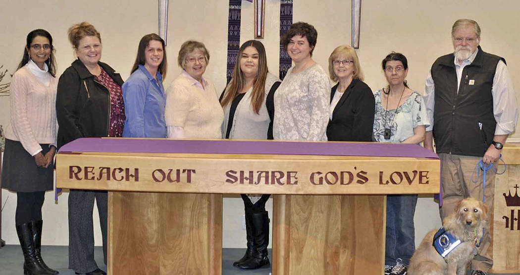 A dozen area nonprofits have received more than $10,000 from Dungeness Valley Lutheran Church, the proceeds from the Yuletide bazaar last November. Receiving checks on March 29 were (from left) Priya Jayadev, executive director, Clallam Mosaic; Rebekah Miller, development associate, Peninsula Behavioral Health; Nicole Brewer, executive director, First Teacher; Linda DeMoss, vice president, Sequim Community Aid; Maria Davila, shelter manager, and Katie Spooner, victim advocate, both of Forks Abuse Program; Carol Pope, North Olympic Foster Parent Association; Klara Murray, volunteer, and John Braasch, president, both of Voices for Veterans, with Braasch’s service dog Sadie. (Kathryn Eastburn photo)