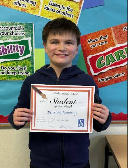 Braxton Romberg was chosen as FMS November Student of the Month for 5th grade. Braxton’s favorites include; lobster, the color green, and playing with friends. Braxton’s social studies teacher said “Braxton is consistently polite and respectful. He is kind and courteous to others and is a friend to everyone. He remembers to raise his hand respectfully in class. He asks questions when he needs clarification on an assignment. He has a good knowledge of historical concepts and likes to keep me briefed on politics. Braxton is also very patriotic, greeting me with a salute most days. He is also interested in trade-school and is related to my favorite electrician- Ray. I enjoy having Braxton in class and he adds a lot of patriotism to the classroom.” His music teacher, Mrs. Murillo said “Braxton is very conscientious and eager to learn. He listens and follows instruction well.” Mrs. Highfield, his PE teacher said “Braxton is always smiling and brings positive energy to any classroom.” His ELA teacher, Ms. Lewis added “Braxton is a pleasure to have in class. He has a quirky sense of humor, and I really enjoy how he mimes the actions from our read aloud. He is always respectful, responsible, and helpful. For example, when I had to be out my substitute teacher named him as one of the most helpful students she’s ever had. I was not surprised by that statement. Braxton is well liked by his peers and the adults in the school. Braxton, congratulations on being Student of the Month.” Braxton would like to thank his family and teachers for supporting him. Way to go, Braxton!