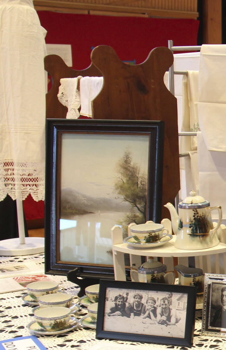 A vintage Norwegian Bunad apron once worn by Pastor Pam Hunter’s ancestor can be seen on the left; a vintage tea set and photos were displayed by Linda Keen.