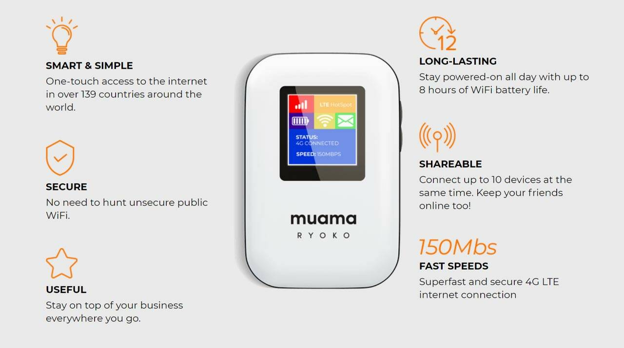 - Long Battery Life: The battery of Muama Ryoko lasts for 8 hours or more of continuous use. In other words, people can use this device without any problem, whenever they need it.