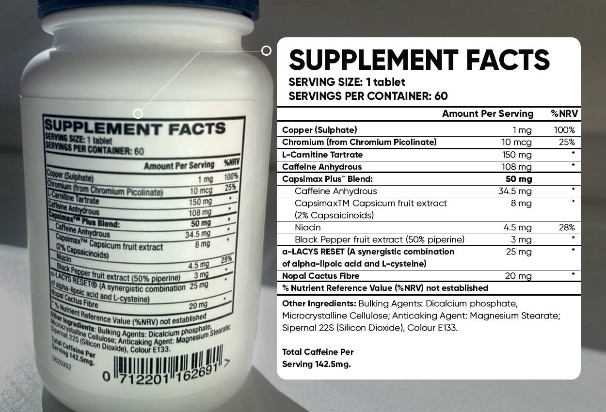 α-Lacys Reset®, Nopal Cactus, L-Carnitine Fumarate, Iodine, Chromium Picolinate, Capsimax Powder, Caffeine, Vitamin B3, Vitamin B6, Vitamin B12, Innoslim, etc.