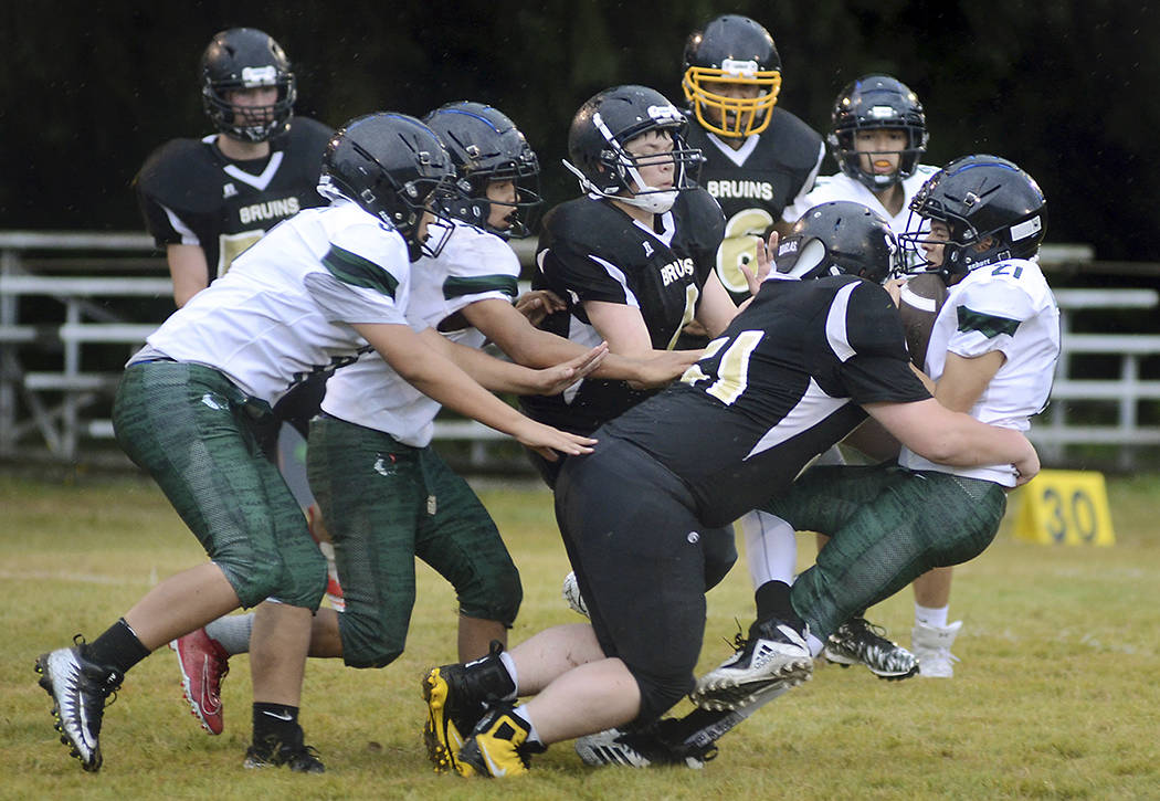 Clallam Bay defender Anthony McGraw (51) zeroes in on his opponent with a dominating tackle during the Bruins’ 88-20 win over Muckleshoot Tribal School on Friday in Clallam Bay. Photo by Mike Salsbury for the Forks Forum.
