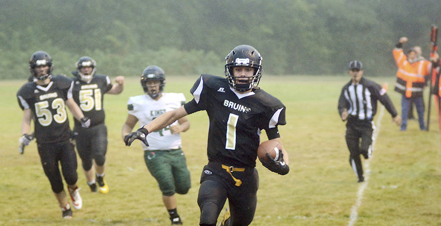 Clallam Bay senior quarterback Ryan Strid sprints to the end zone for a second quarter touchdown during the Bruins’ 68-20 win over the Muckleshoot Tribal School on Friday at Clallam Bay. Photo by Mike Salsbury for The Forks Forum.
