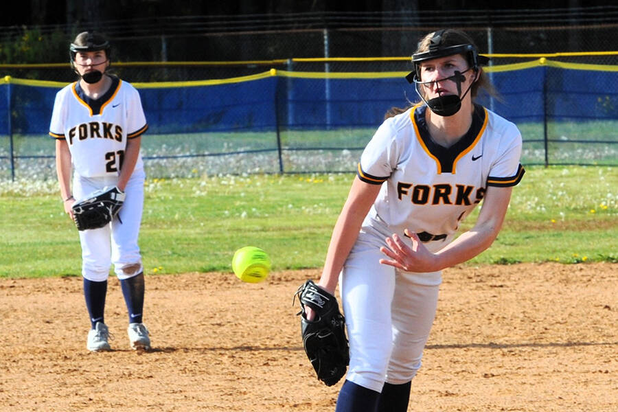 With Spartan Kylie Hull ready at shortstop, Forks pitcher Bailey Johnson delivers the pitch as the Forks Jv’s defeated the North Beach varsity 20 to 5. In the first game, the Forks varsity defeated North Beach varsity 29 to 4. Photo by Lonnie Archibald