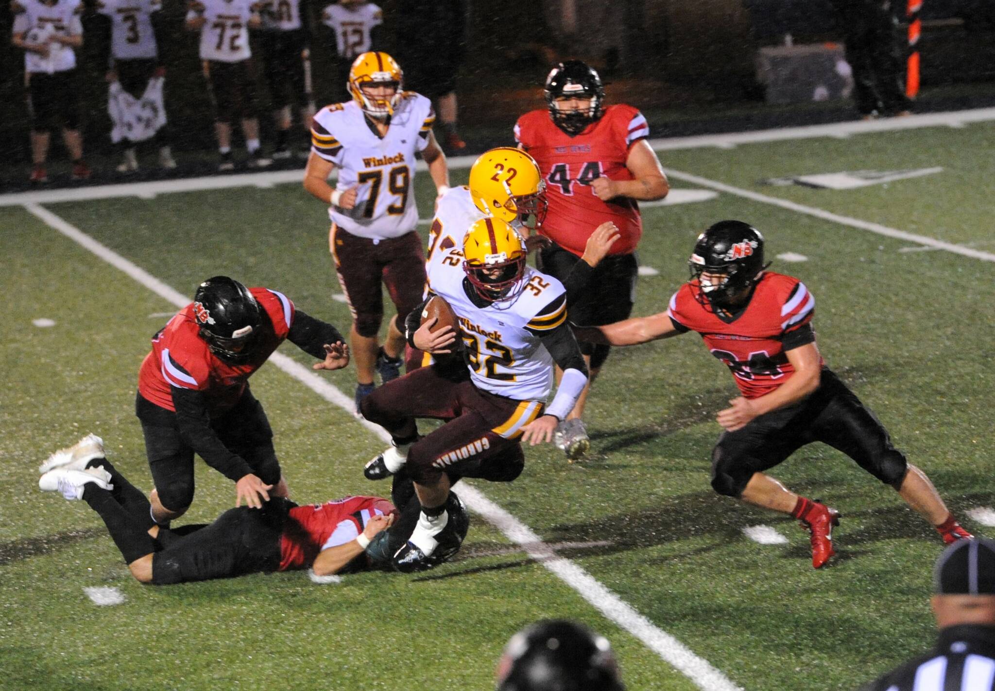 Playing in a fierce and windy rainstorm in Forks, Neah Bay got seven touchdowns from Jodell Wimberley and four touchdowns from Tyler Swan. Swan also had eight 2-point conversions while Wimberley had one as the Red Devils’ one-two punch on the ground accounted for all of Neah Bay’s scoring. Wimberley finished with 44 points while Swan had 42.