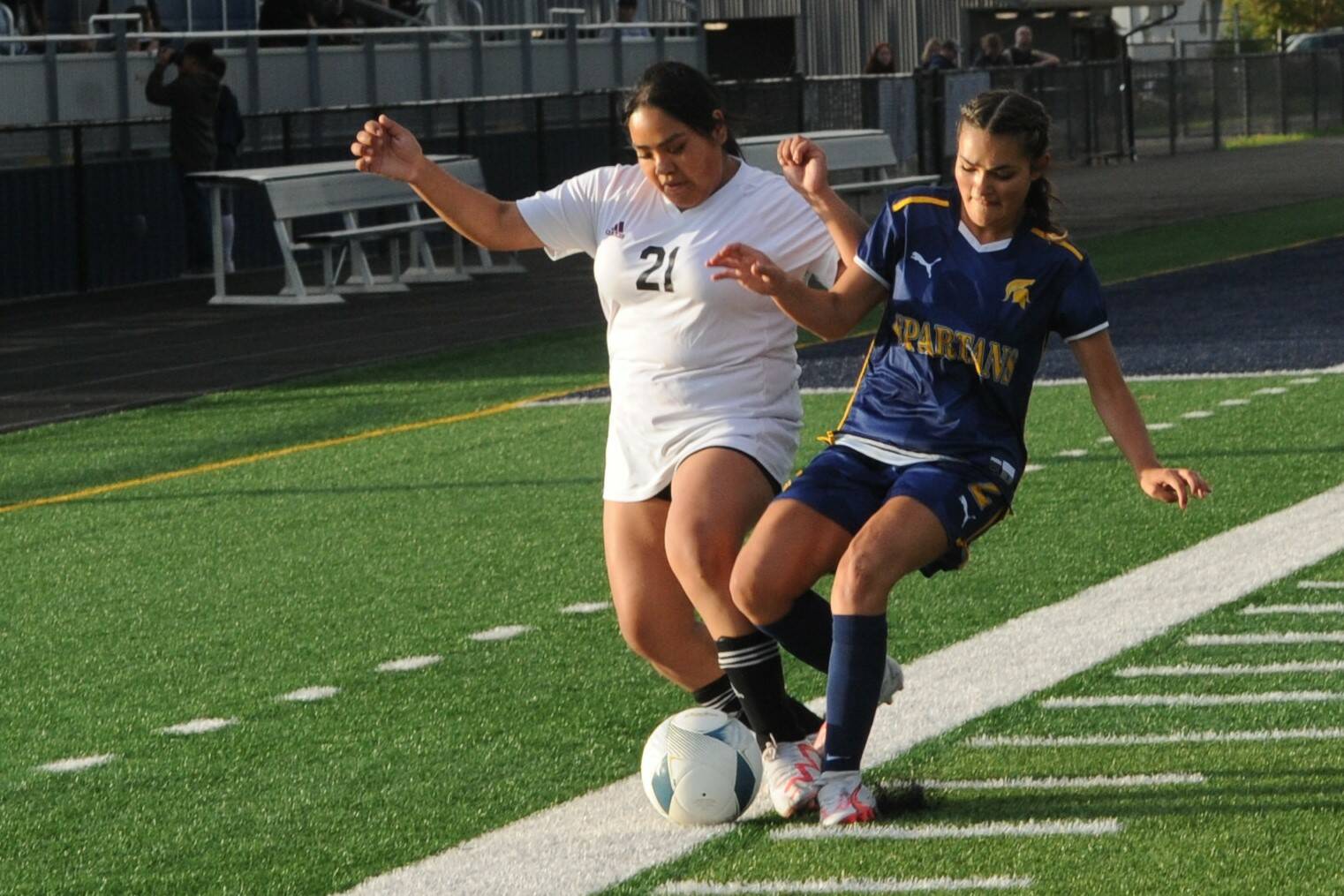 Forks’ Miley Blanton keeps her eye on the ball against Raymond-South Bend on Sept. 11 at Spartan Stadium where the Ravens defeated the Spartans 5 to 0 in this league contest. Photo by Lonnie Archibald